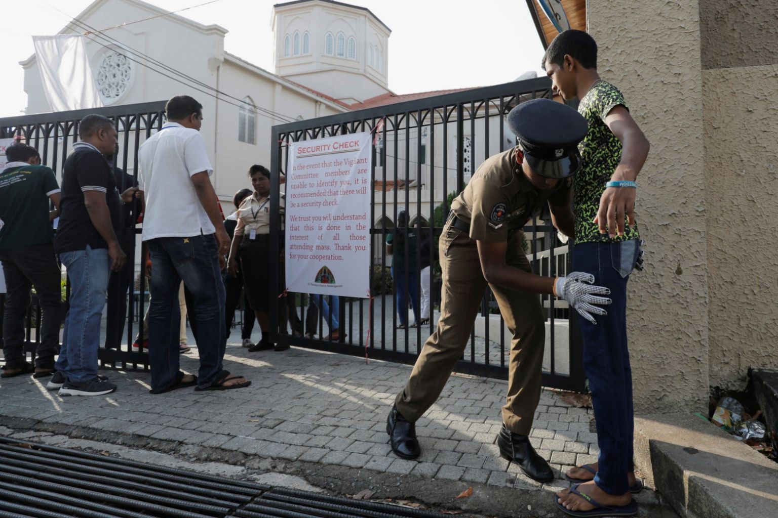 A police officer searches a worshipper at the main entrance of St Theresa's church as the Catholic churches in Sri Lanka restart their Sunday services in Colombo, Sri Lanka, on May 12, 2019.