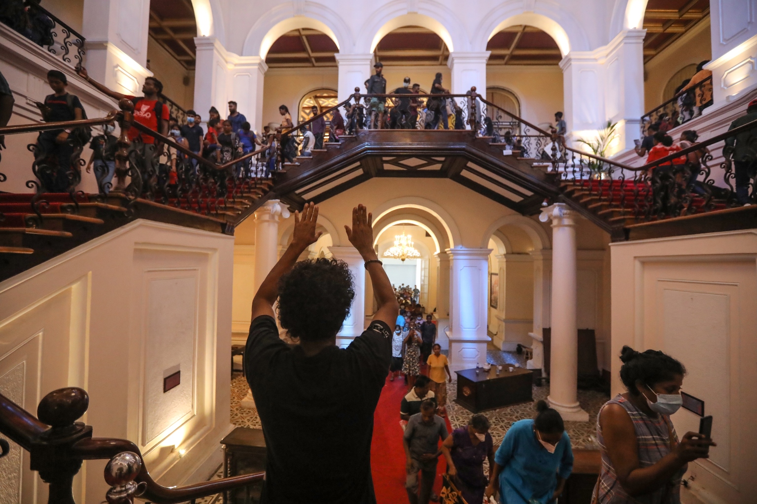 A protester tries to control the crowd at the President's palace in Colombo, Sri Lanka, on July 12, 2022.