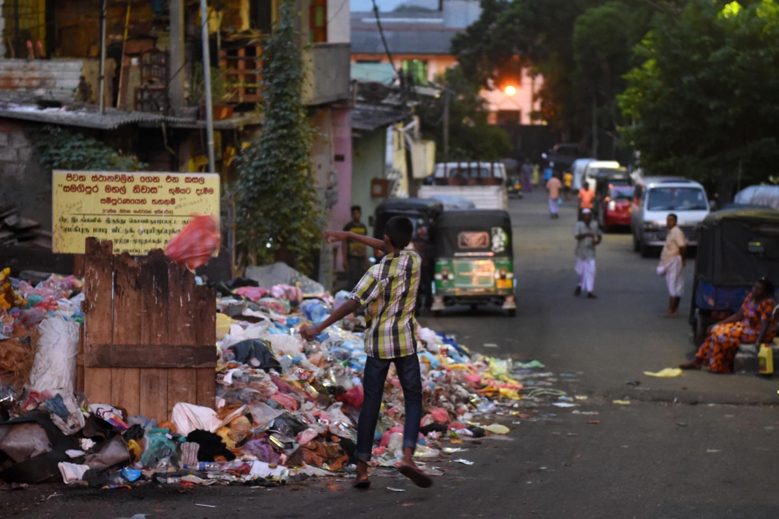 A Sri Lankan man throwing rubbish onto a pile of garbage on a street in Colombo on June 26, 2017.