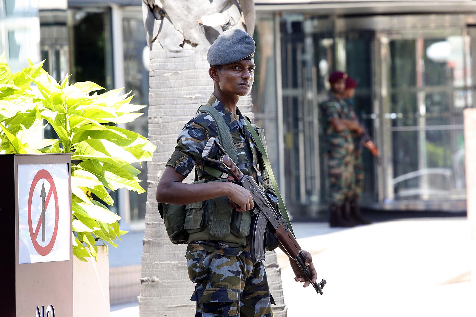 Sri Lankan security personnel stand guard outside the World Trade Centre after multiple fatal explosions occurred the day before, in Colombo, Sri Lanka, on April 22, 2019.