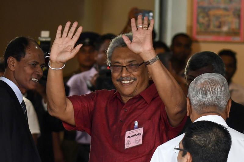 Former Sri Lankan president Mahinda Rajapakse's younger brother Gotabhaya waves to supporters in Colombo on Oct 7, 2019, after filing his nomination papers to contest in the upcoming presidential election.