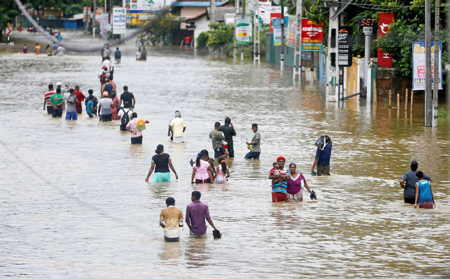 People walk through a flooded road after they moved out from their houses in Biyagama, Sri Lanka, on May 17, 2016.