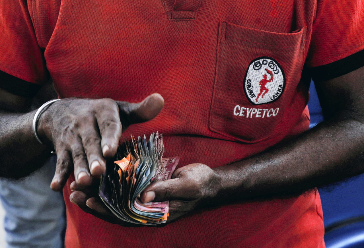 A worker holding Sri Lankan currency at a Ceylon Petroleum Corporation fuel station in Colombo, Sri Lanka, on Feb 21, 2022.