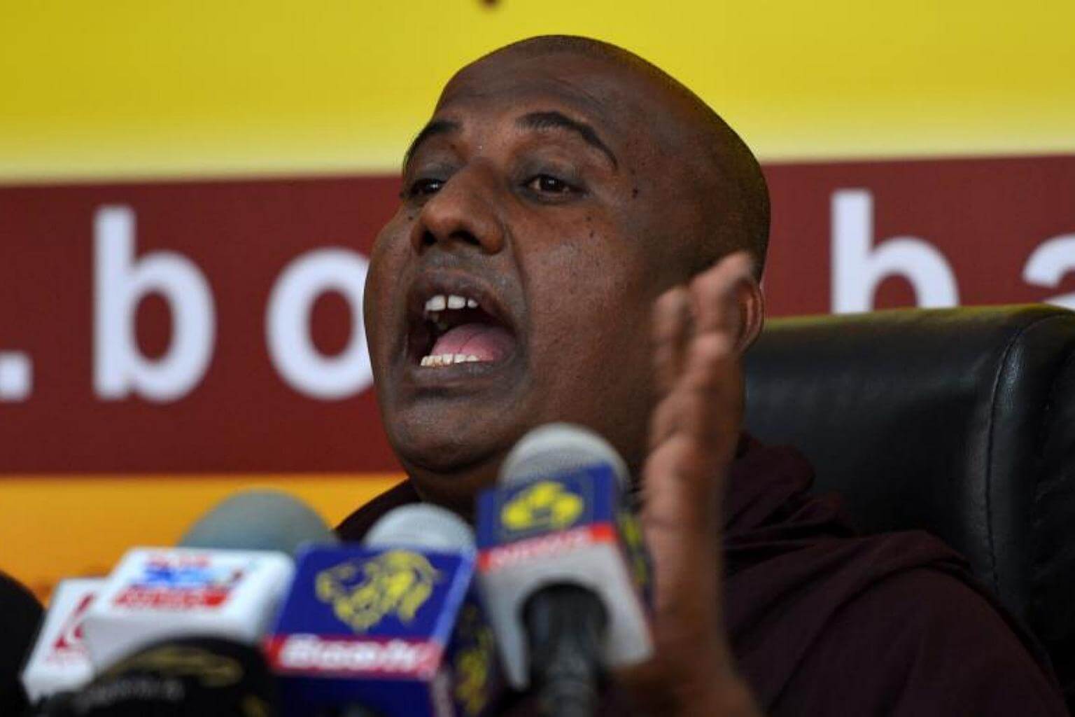 Srilankan monk Maagalkande Sudaththa, General Secretary of Sinhala Ravaya, speaks during a press conference in Colombo on July 10, 2017.