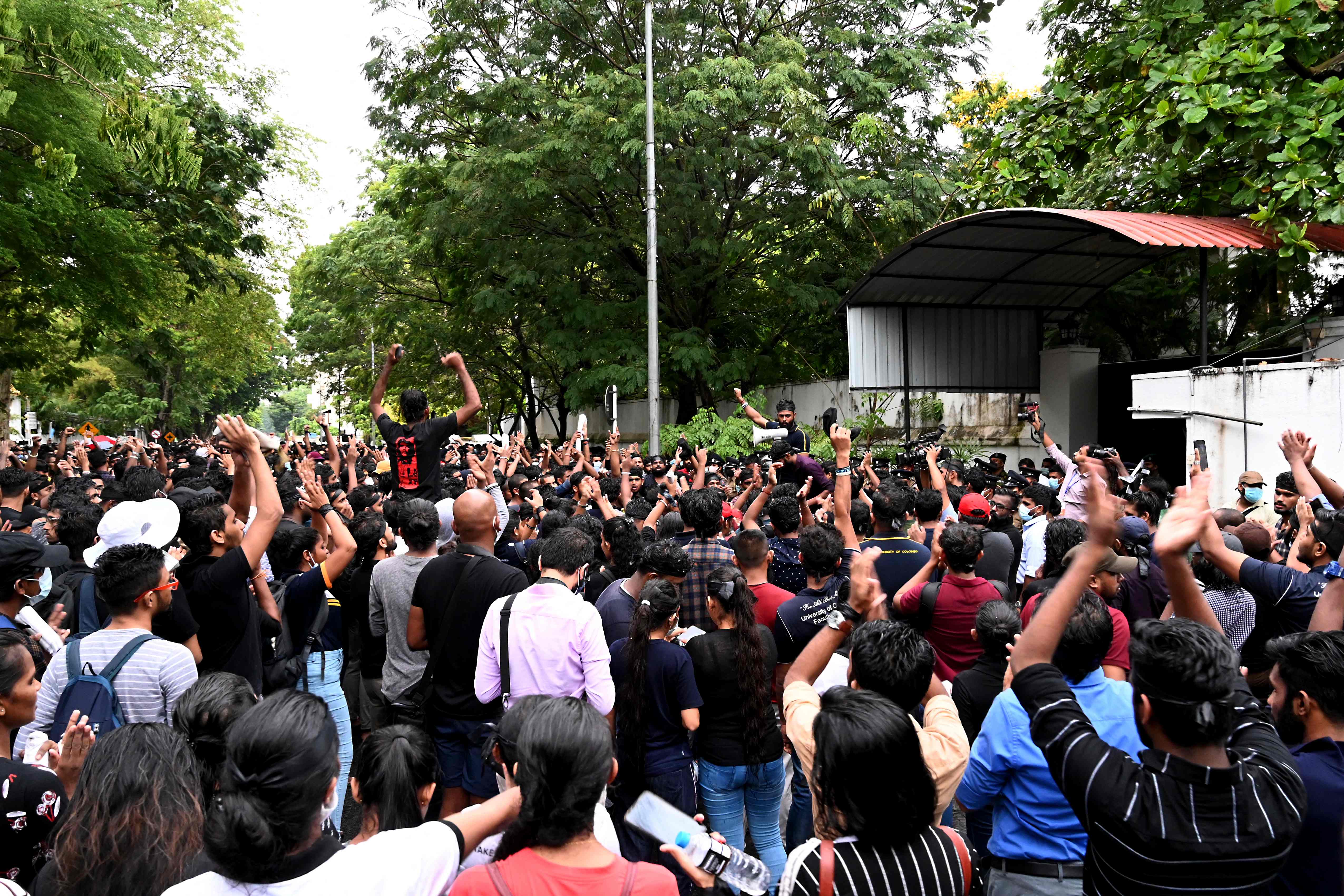 Demonstrators take part in a protest outside Prime Minister Mahinda Rajapaksa's residence, in Colombo, on April 5, 2022.