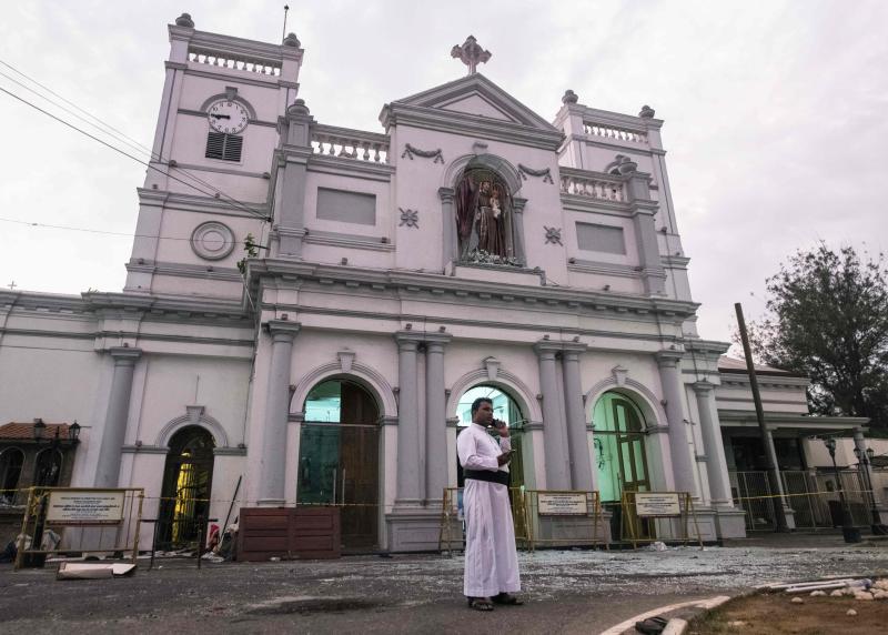 A priest speaks on the phone outside St Anthony's Shrine in Colombo on April 26, 2019, following a series of bomb blasts targeting churches and luxury hotels on Easter Sunday in Sri Lanka.