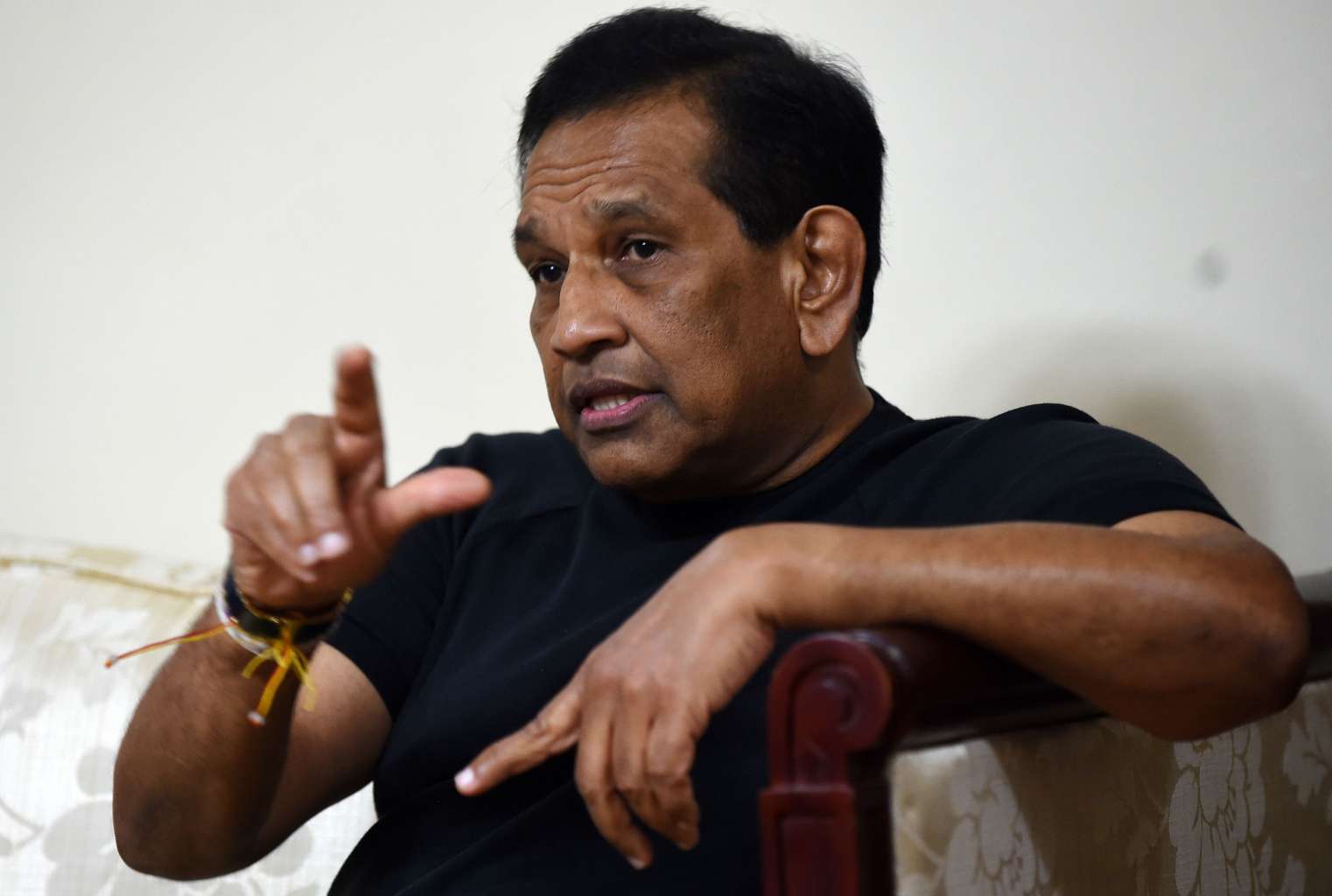 Rajitha Senaratne gestures as he addresses Colombo-based foreign correspondents at his official residence in Colombo on May 14, 2016.