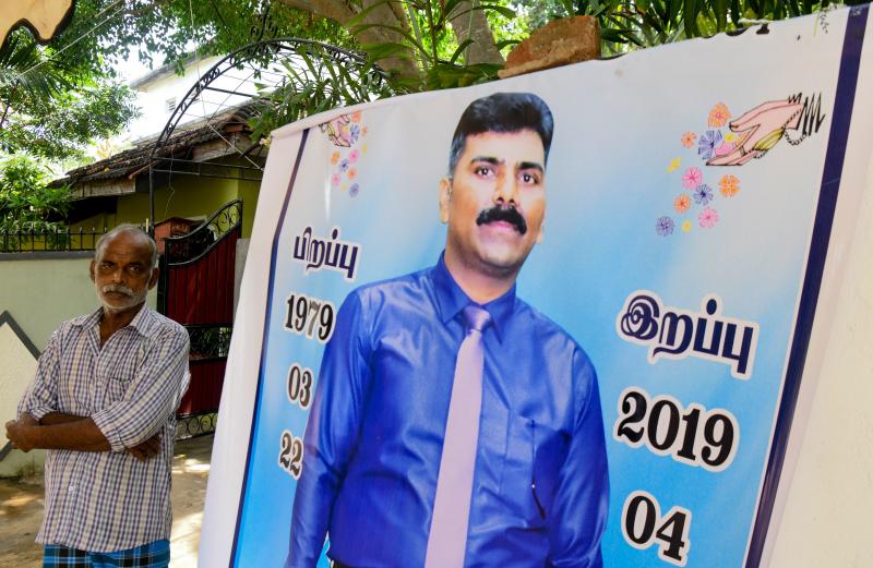 Mr Velusami Raju beside a banner of his son Ramesh Raju, who died stopping a suicide bomber in the Zion evangelical church in Batticaloa, Sri Lanka.