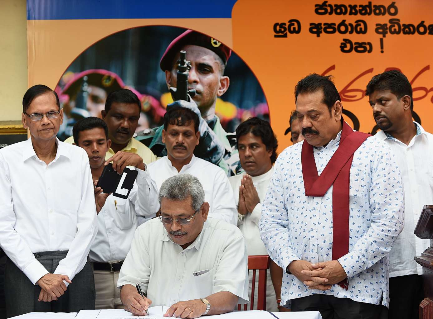 Gotabhaya Rajapakse (centre) signs a petition against a UN-mandated investigation against war crimes during the Tamil separatist war as his brother and former president, Mahinda Rajapakse (front right) looks on.