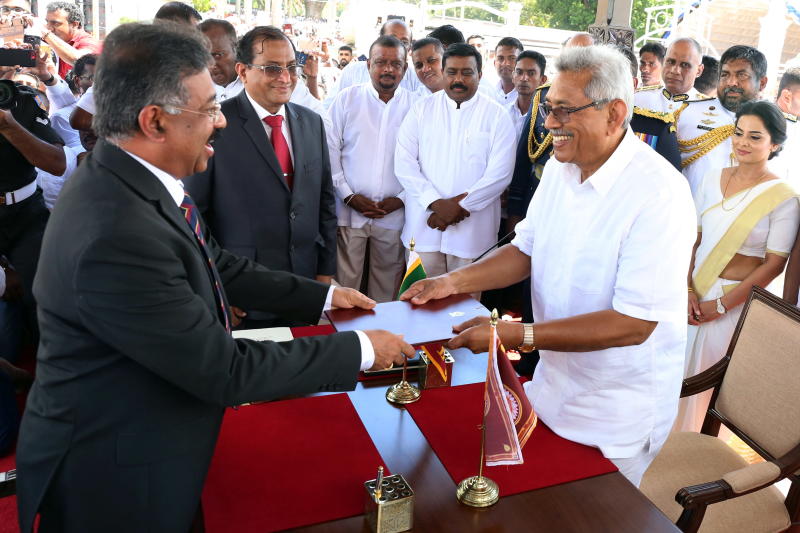 Sri Lanka's president-elect Gotabaya Rajapaksa (right) with chief justice Jayantha Jayasuriya during his swearing-in ceremony in Anuradhapura, Sri Lanka, on Nov 18, 2019.