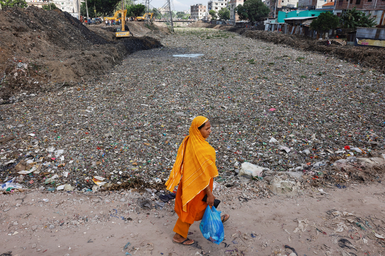 A woman walks along a bridge over a canal full of waste in Dhaka, Bangladesh, on Aug 11, 2022.
