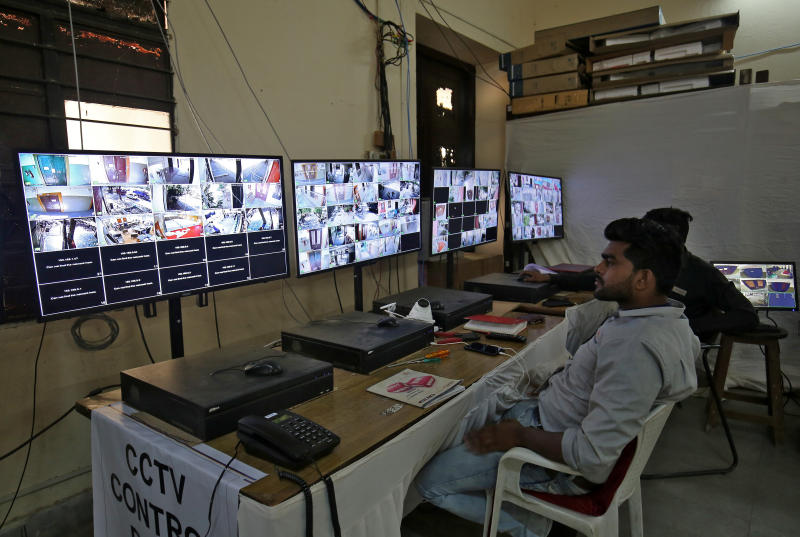 Election staff members monitor screens connected to CCTV cameras set up in and outside vote counting centres in Ahmedabad, India, on May 21, 2019.