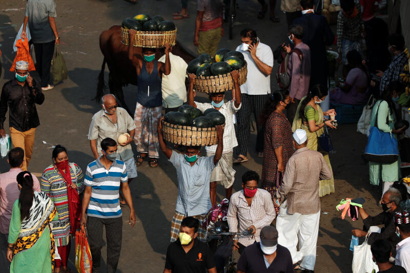 People wearing protective masks are seen at a fruit and vegetable market in Mumbai, India, on March 28, 2020.