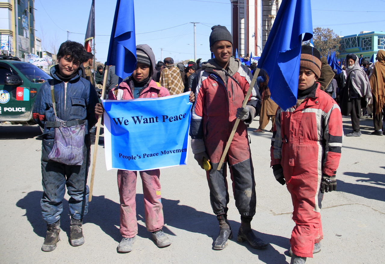 Afghans hold placards during a protest to demand peace, in Ghazni, Afghanistan, on Feb 16, 2020.
