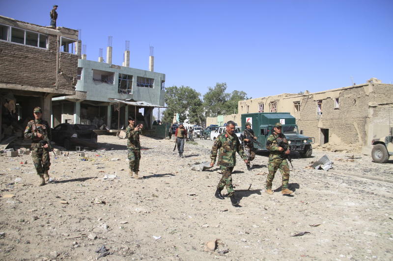 Afghan security officials inspect the scene of a car bomb explosion in Ghazni, Afghanistan, on July 7, 2019.