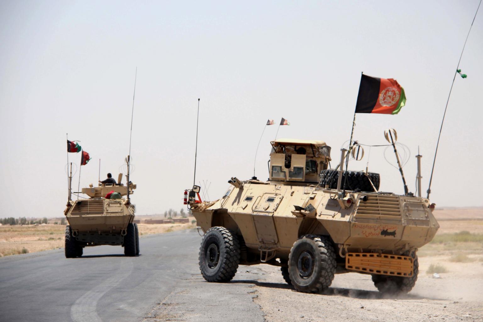 Afghan security officials patrol on highway in Helmand, Afghanistan on June 14, 2020.