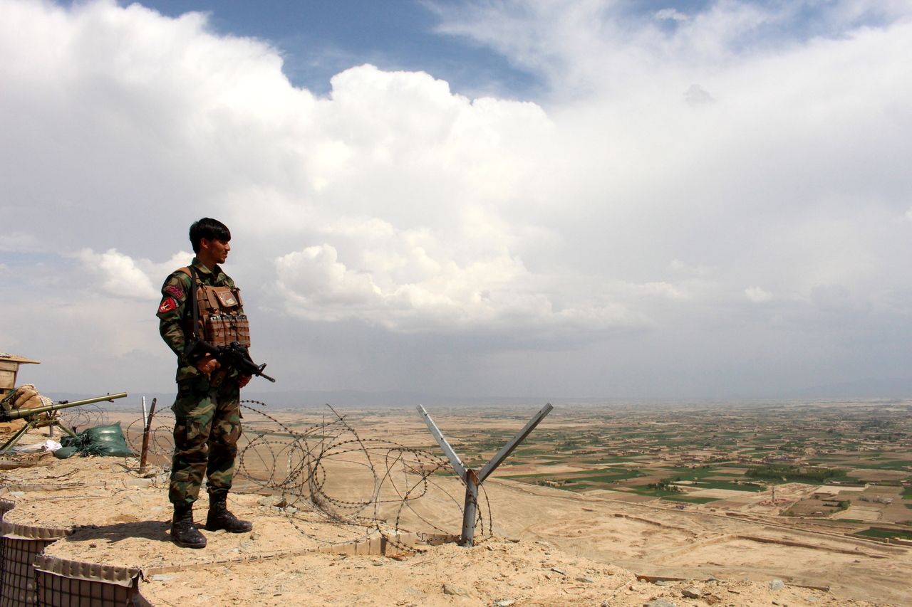 An Afghan soldier stands guard as soldiers prepare for an operation to recapture the military base that the Taleban have overrun in Ghazni, Afghanistan, on May 2, 2021.