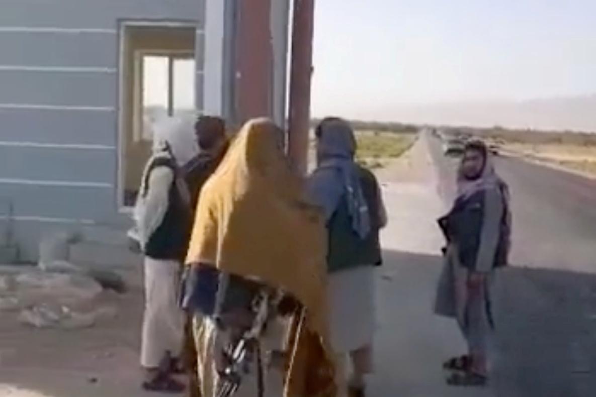 Taleban militants are seen at the entrance gate of Aybak, Samangan province, Afghanistan, on Aug 9, 2021.
