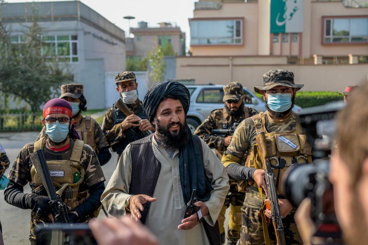 A Taliban official speaks to the media after halting a demonstration by women protesters outside a school in Kabul on Sept 30, 2021.