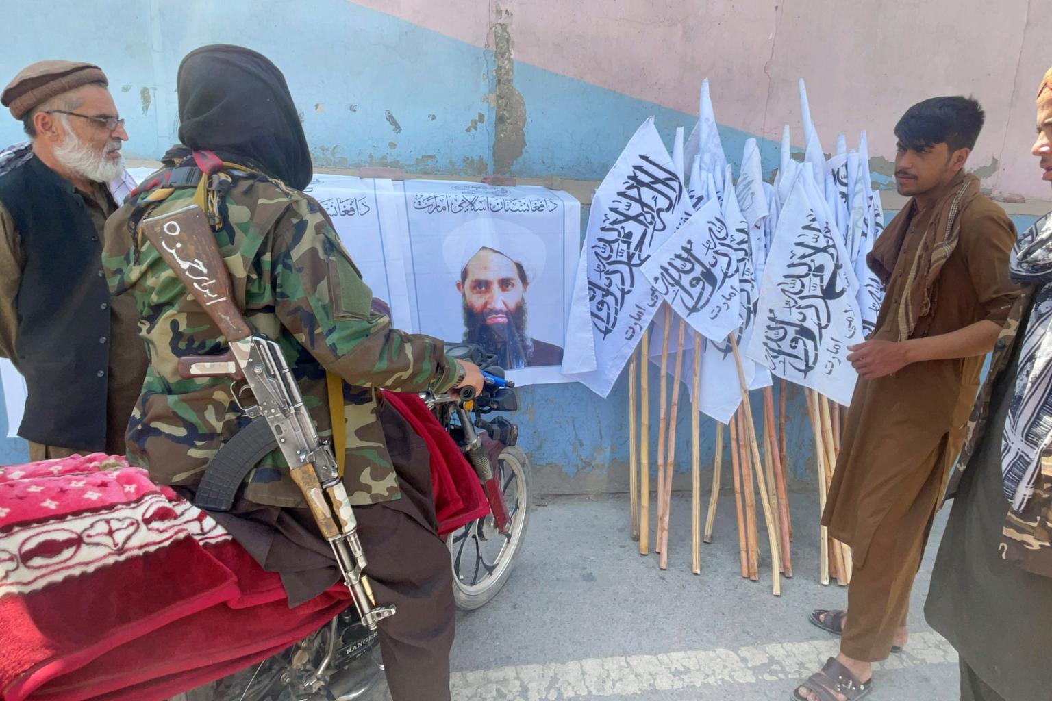 Taliban members standing near a poster of their leader Haibatullah Akhundzada in Kabul, on Aug 26, 2021.