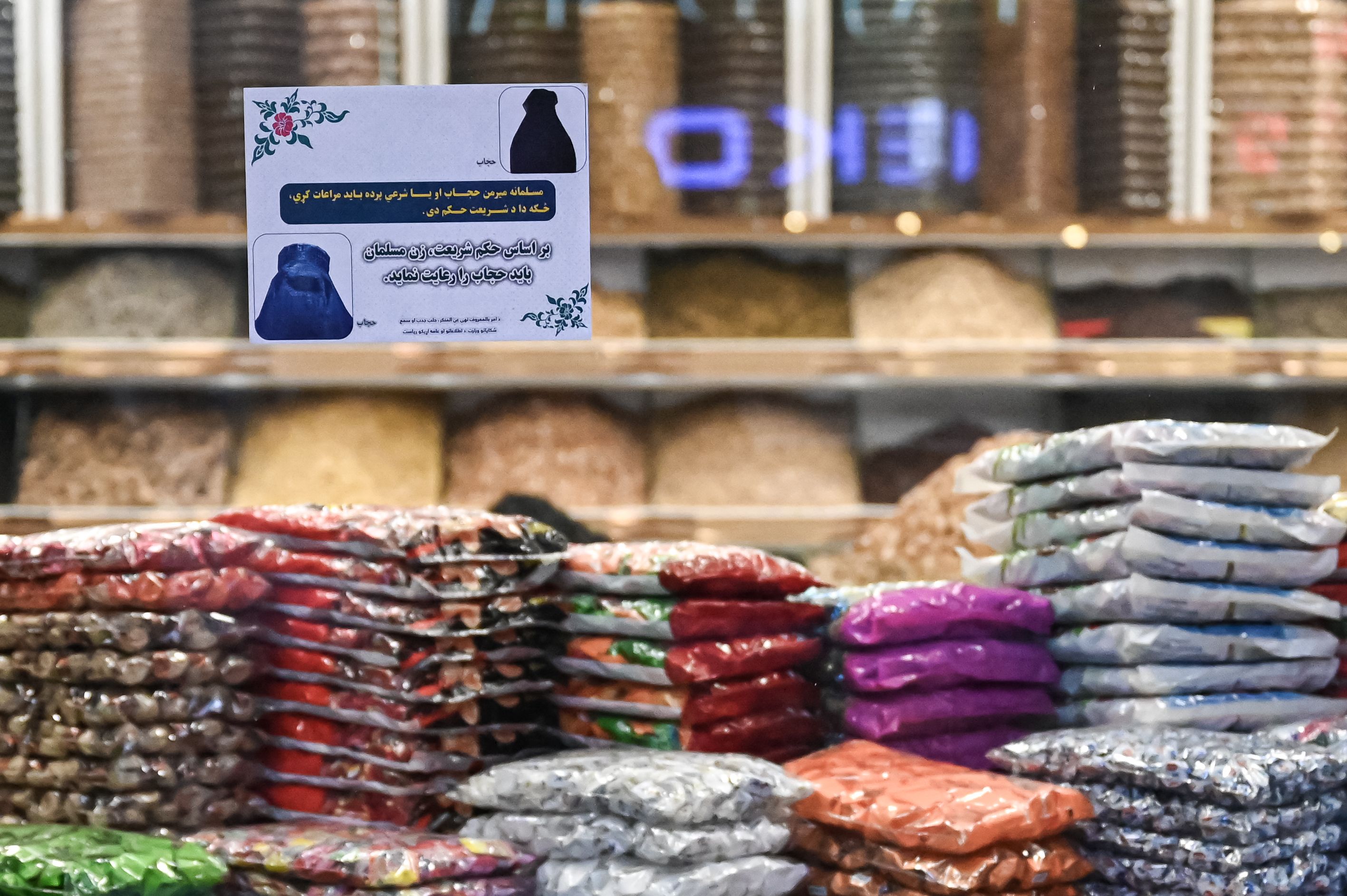 The poster, which includes an image of the face-covering burqa, was slapped on cafes and shops this week by the Ministry for the Promotion of Virtue and Prevention of Vice.