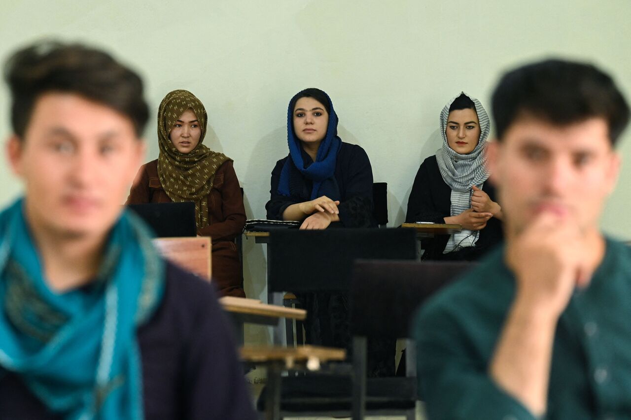 Students attend their class after private universities were reopened in Kabul, on Sept 6, 2021.