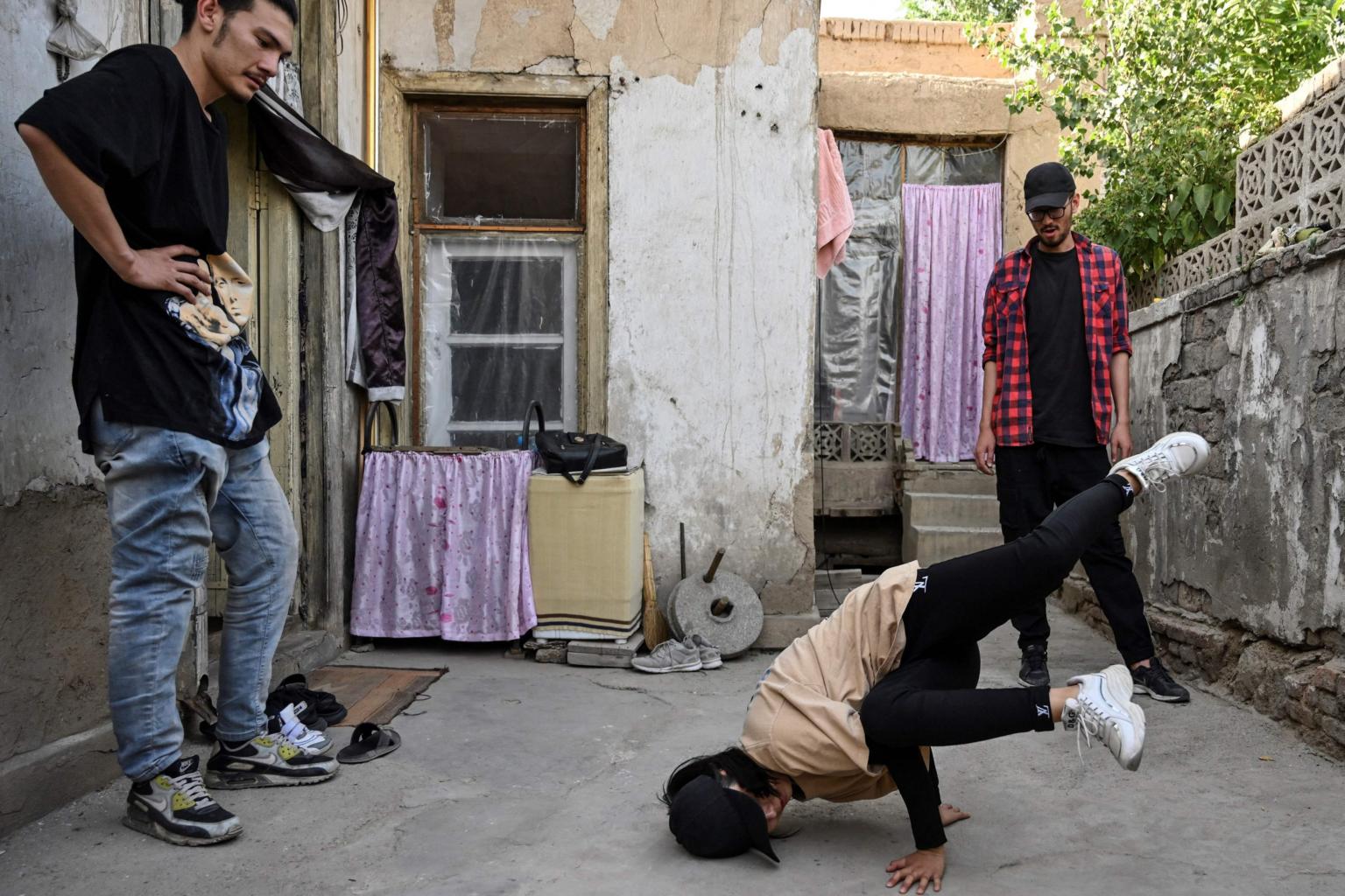 Manizha Talash (centre) practices a move as two members of her breakdance troupe look on in Kabul, on June 12 2021.