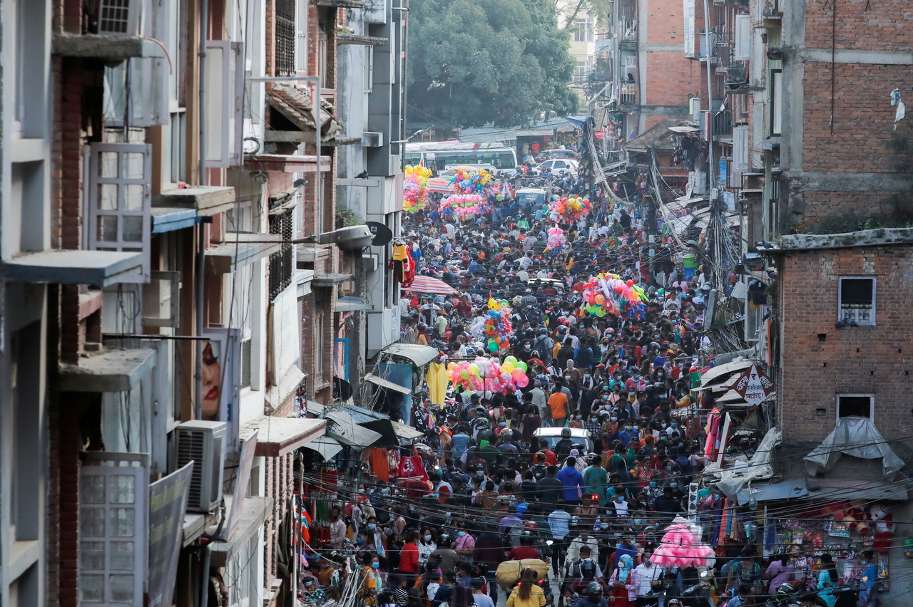 Shoppers crowd at a market in Lagankhel in Lalitpur, Nepal, on Oct 8, 2021.