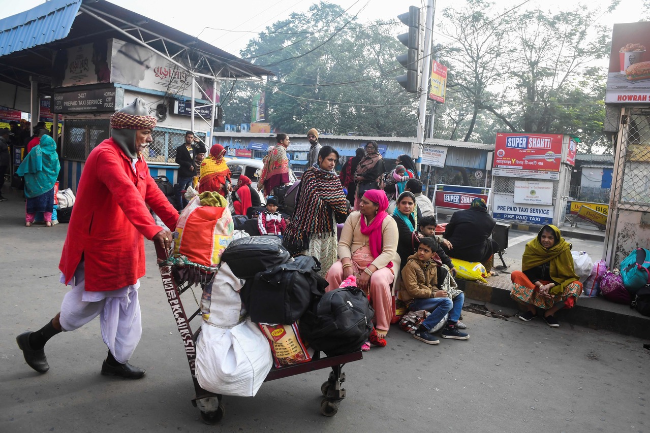 People wait for transportation outside the Howrah railway station during a nationwide general strike to protest the Indian government's economic policies, in Kolkata, on Jan 8, 2020.