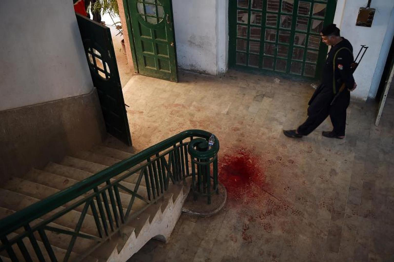 A Pakistani policeman looks a blood-stained floor of an Agriculture Training Institute following an attack by Taliban militants in Peshawar, on Dec 1, 2017.