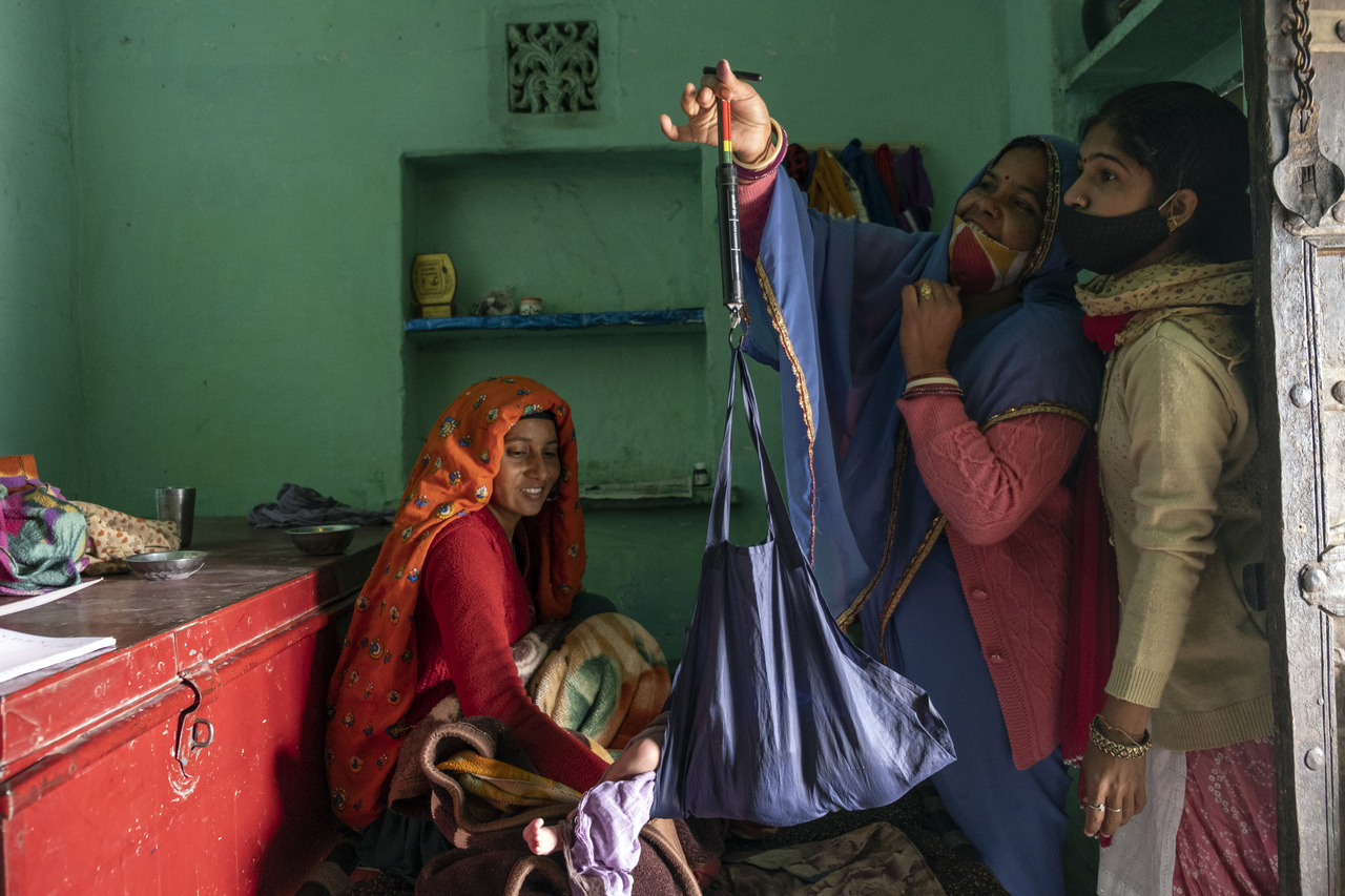 <p>Bhanwar Bai Jadoun, center, an accredited social healthcare activist, and Anita Chowdhary, left, an auxiliary nurse midwife, discuss postnatal health care with new mothers in Bagdoli, India, on Feb. 10, 2022. Over a million female health workers treat IndiaÕs most at-risk women and children, for little pay and sometimes at the cost of their own lives. (Saumya Khandelwal/The New York Times)</p>