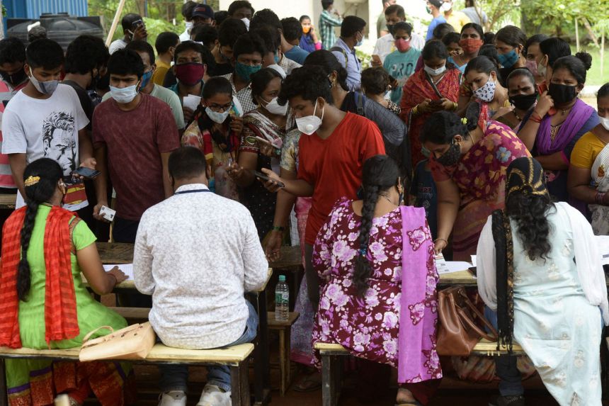Residents lining up to register for a dose of the Covaxin vaccine during a vaccination drive at a school in Hyderabad on July 1, 2021.