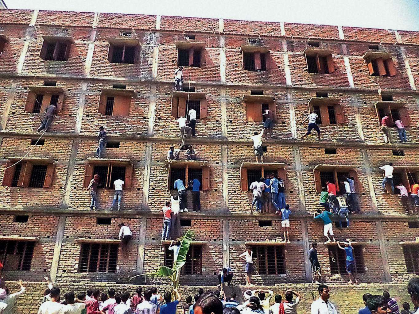 Family members scaling the wall of a school building in Bihar to help students cheat during exams in 2015.