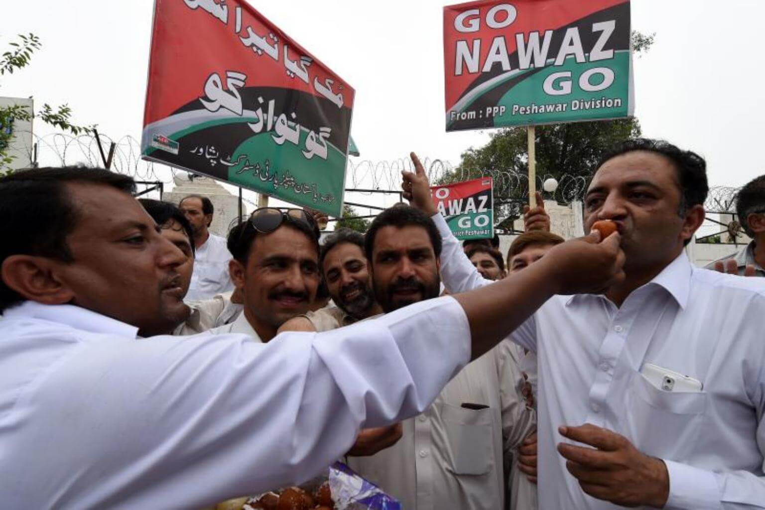 Activists of Pakistan Tehreek-e-Insaf celebrate the Supreme Court decision against Prime Minister Nawaz Sharif, in Peshawar on July 28, 2017.