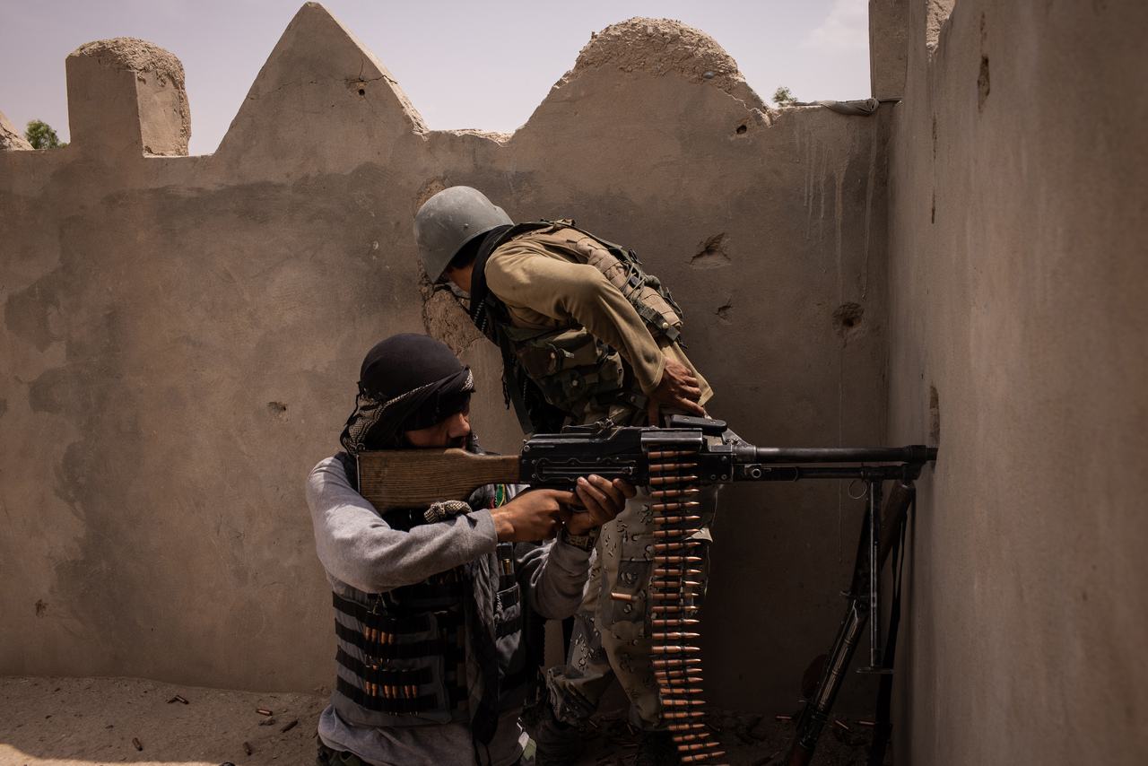 An Afghan soldier fires a machine gun at Taleban positions across the street in Lashkar Gah, Afghanistan, on May 10, 2021.