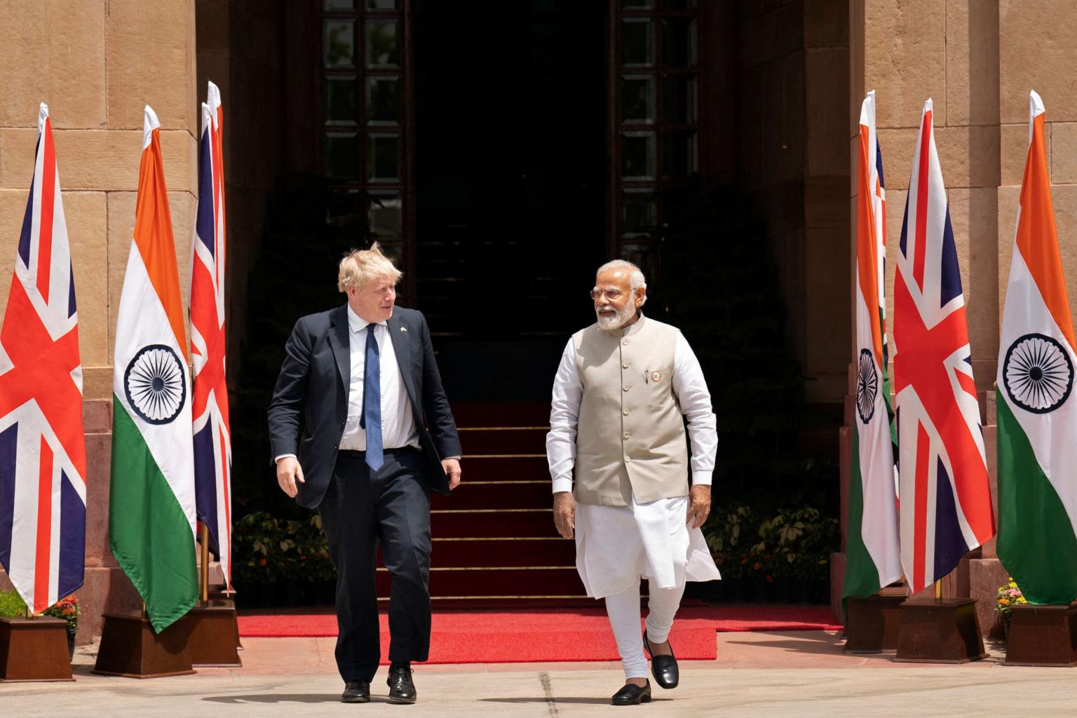 British Prime Minister Boris Johnson and his Indian counterpart Narendra Modi in New Delhi on April 22, 2022.