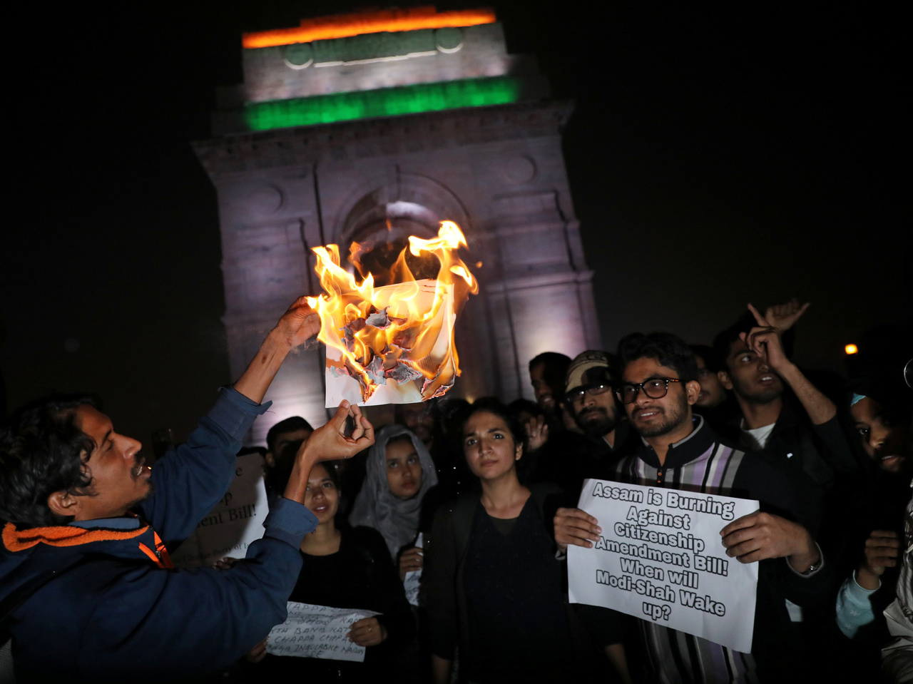 Demonstrators burn a copy of India's Citizenship Amendment Bill during a protest in New Delhi on Dec 12, 2019.