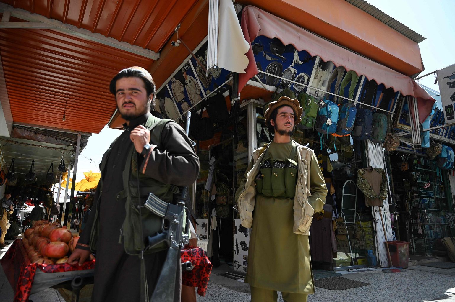 Taliban fighters arrive to shop at Bush market in Kabul on Sept 9, 2021.
