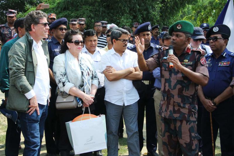 Lieutenant-Colonle Manjurul Hassan (right) of the Bangladeshi 34th Border Guard Battalion speaking to members of the UN Security Council delegation in Tombru, Bangladesh, on April 29, 2018.