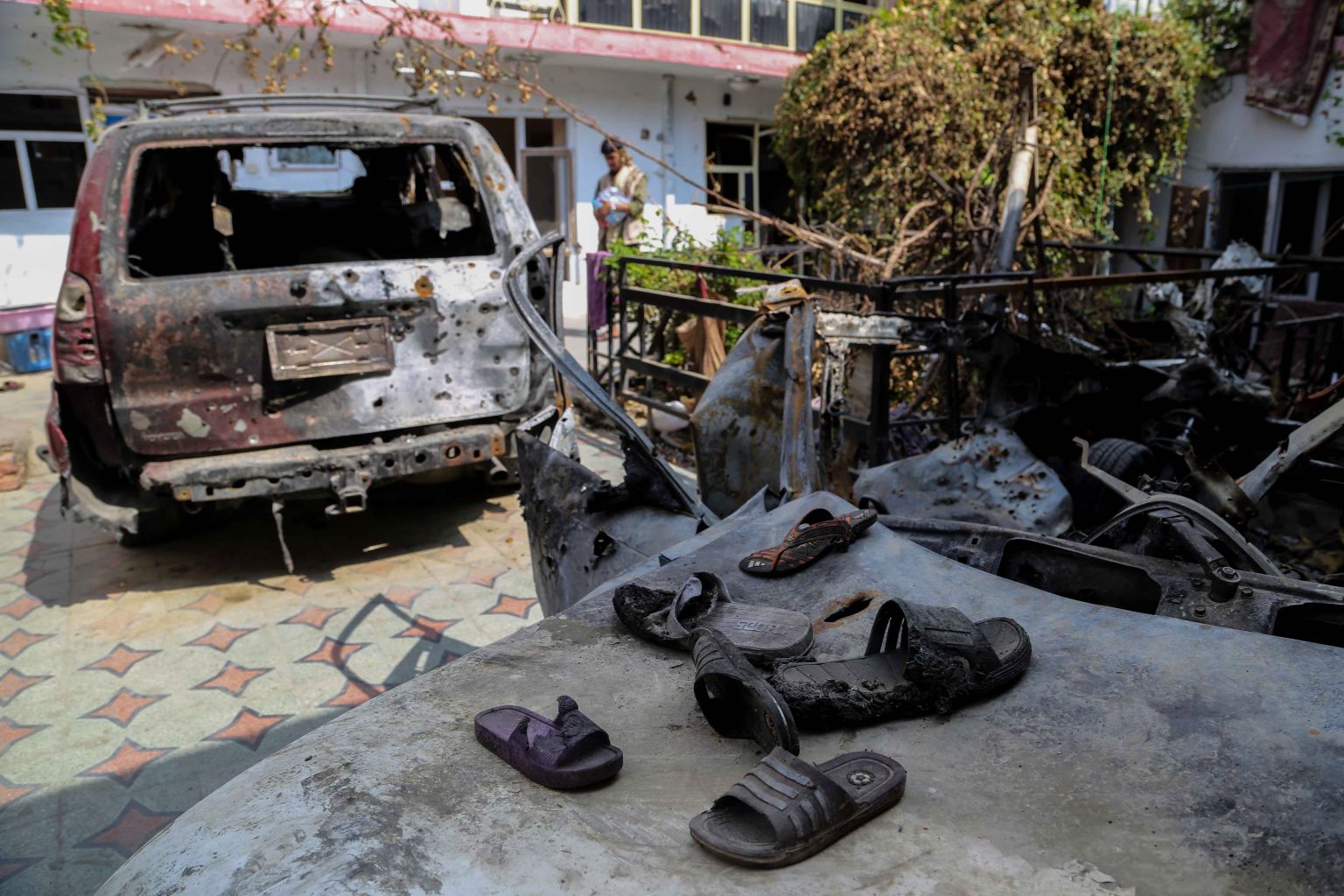 Family members of the drone strike victims stand beside the wreckage of vehicles damaged in the strikes in Kabul.