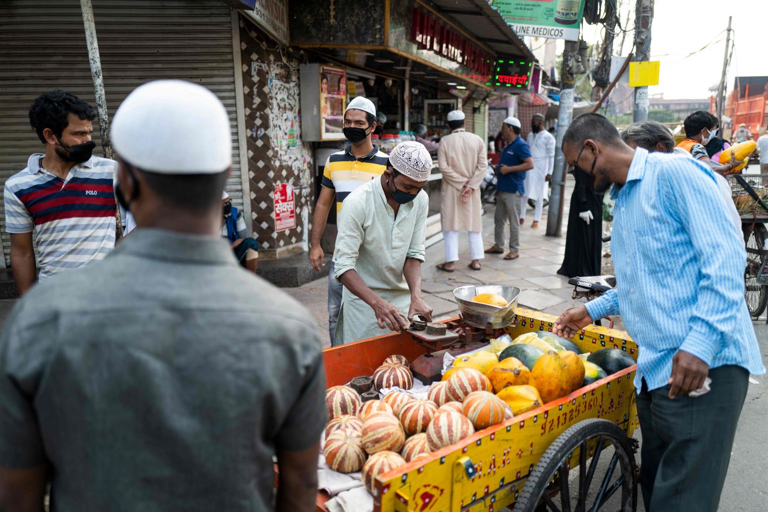 Muslims buy fruit from a vendor for breaking fast during the holy month of Ramadan in New Delhi on April 28, 2020.