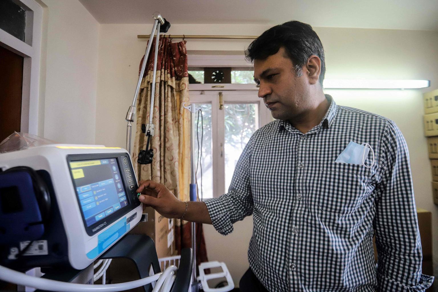 Nepal Ventilator Services co-founder Bishal Dhakal checks ventilators at a warehouse before they are rented out to hospitals treating Covid-19 patients in Kathmandu on June 14, 2021.