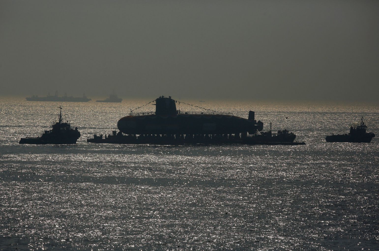 India's third Scorpene-class submarine INS Karanj is seen silhouetted as a tugboat pulls it in Mumbai, India, on Jan 31, 2018.