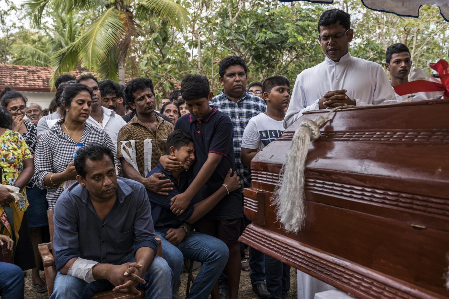Mourners in Negombo, Sri Lanka, at the burial of three members of the same family who were killed in the suicide bomb attack at St Sebastian Church, on April 22, 2019.