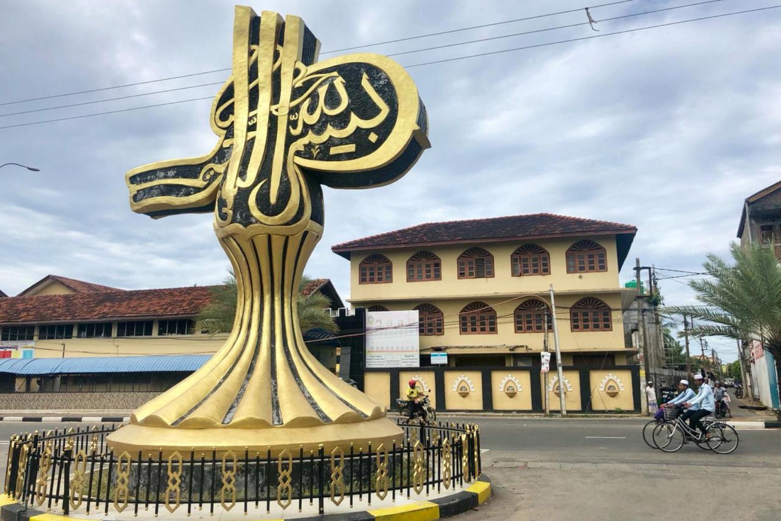 Muslim boys ride their bicycles past a sculpture in Kattankudy, Sri Lanka on June 10, 2019. The Arabic scripture reads "In the name of God".