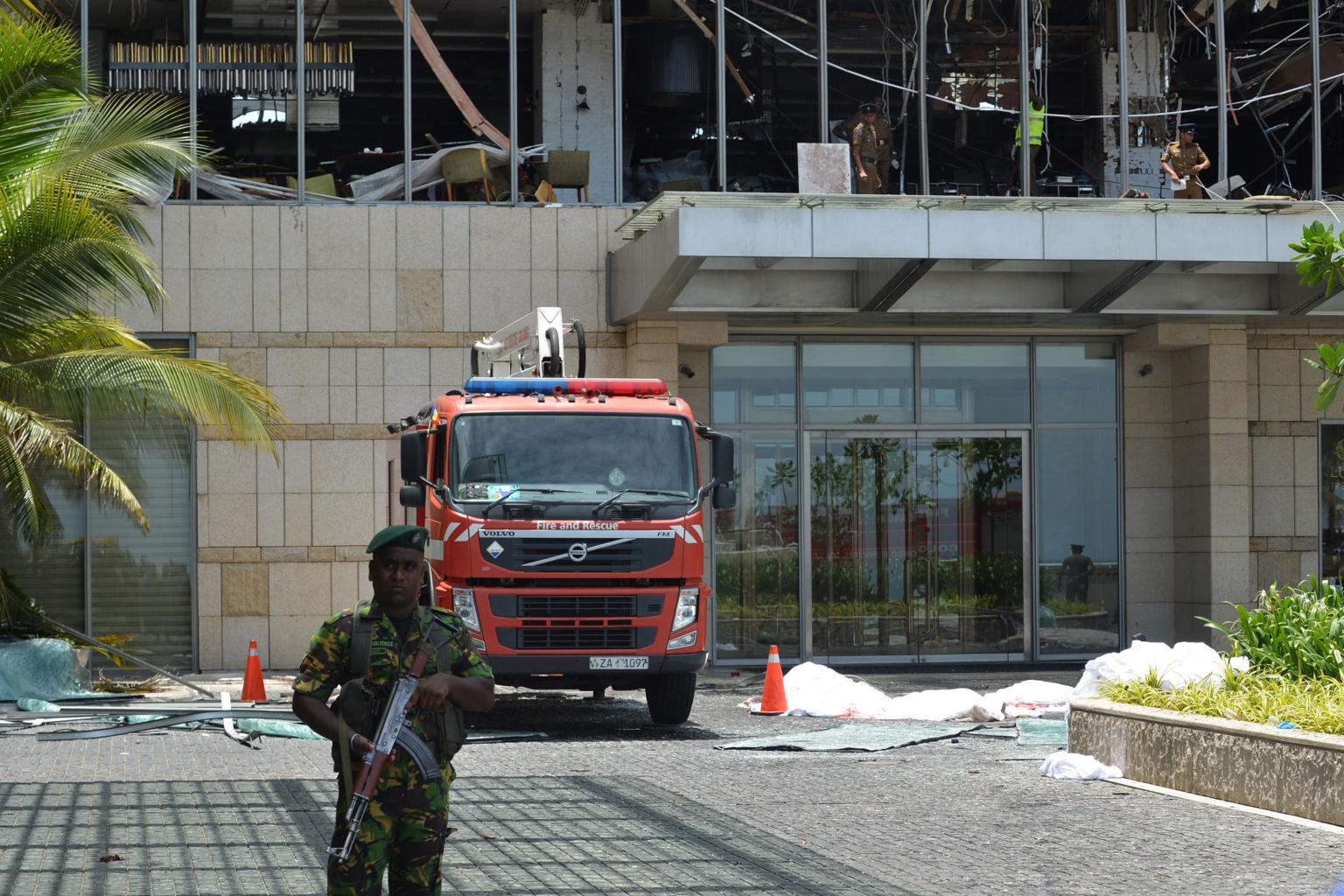 Sri Lankan security personnel stand guard at the entrance of Shangri-La Hotel in Colombo, on April 21, 2019 following an explosion.