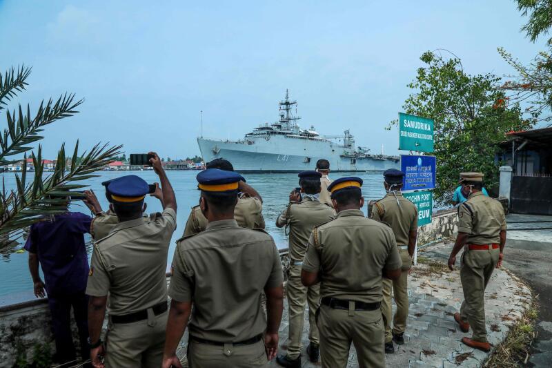 The warship INS Jalashwa arriving at Cochin port in Kerala, India, on May 10, 2020.