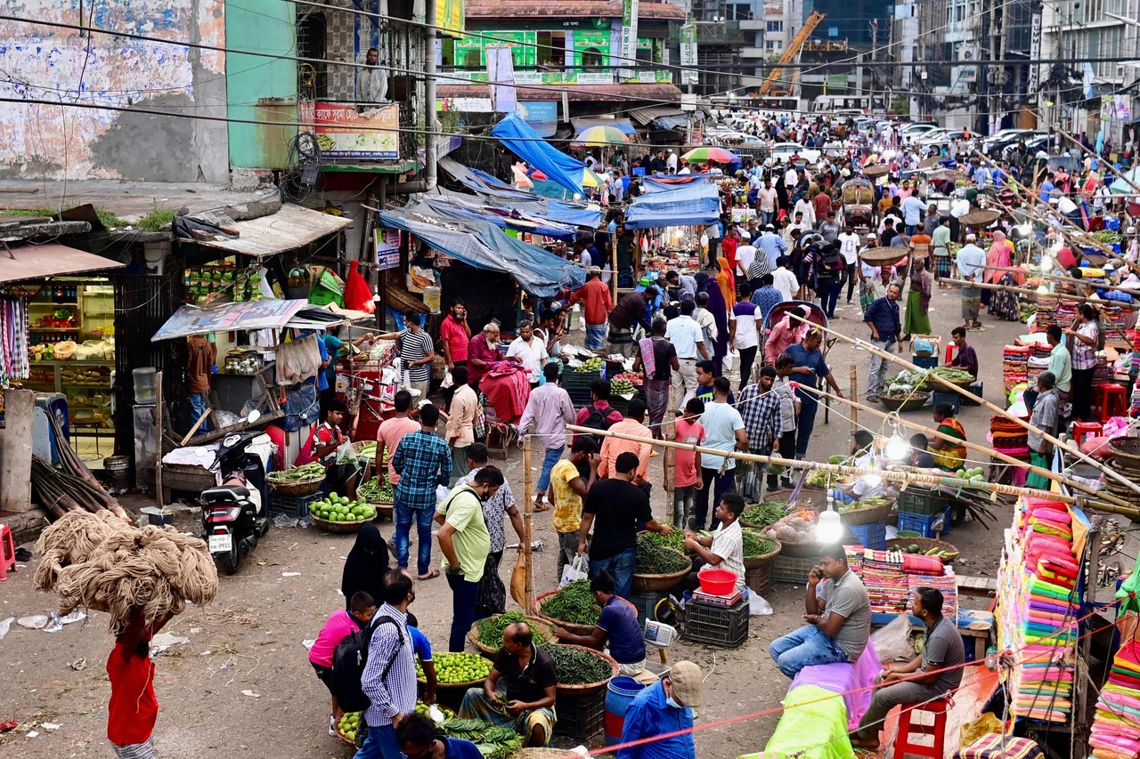 People buy vegetables in a wholesale market in Dhaka on June 26, 2022.