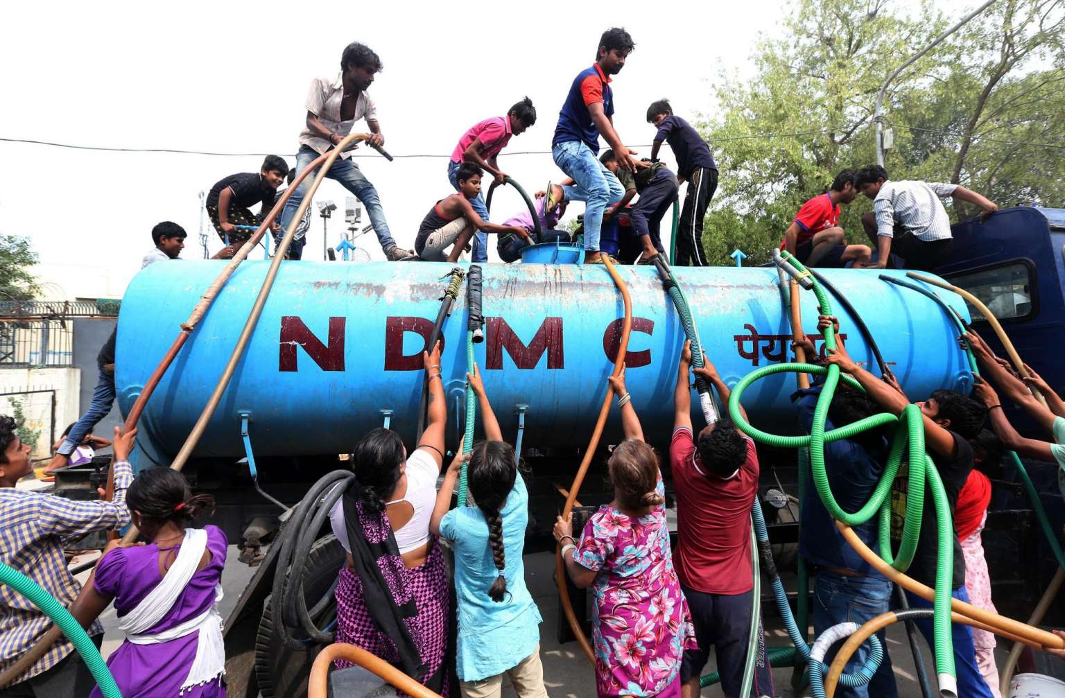Indian people collect water from a water tanker, in New Delhi, on June 28, 2016.