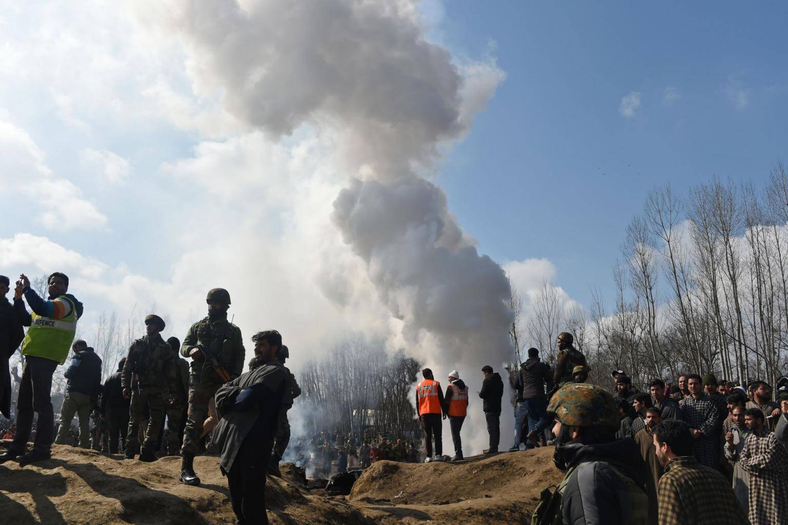 Indian soldiers and Kashmiri onlookers stand near the remains of an Indian Air Force helicopter after it crashed in Budgam district, outside Srinagar, on Feb 27, 2019.